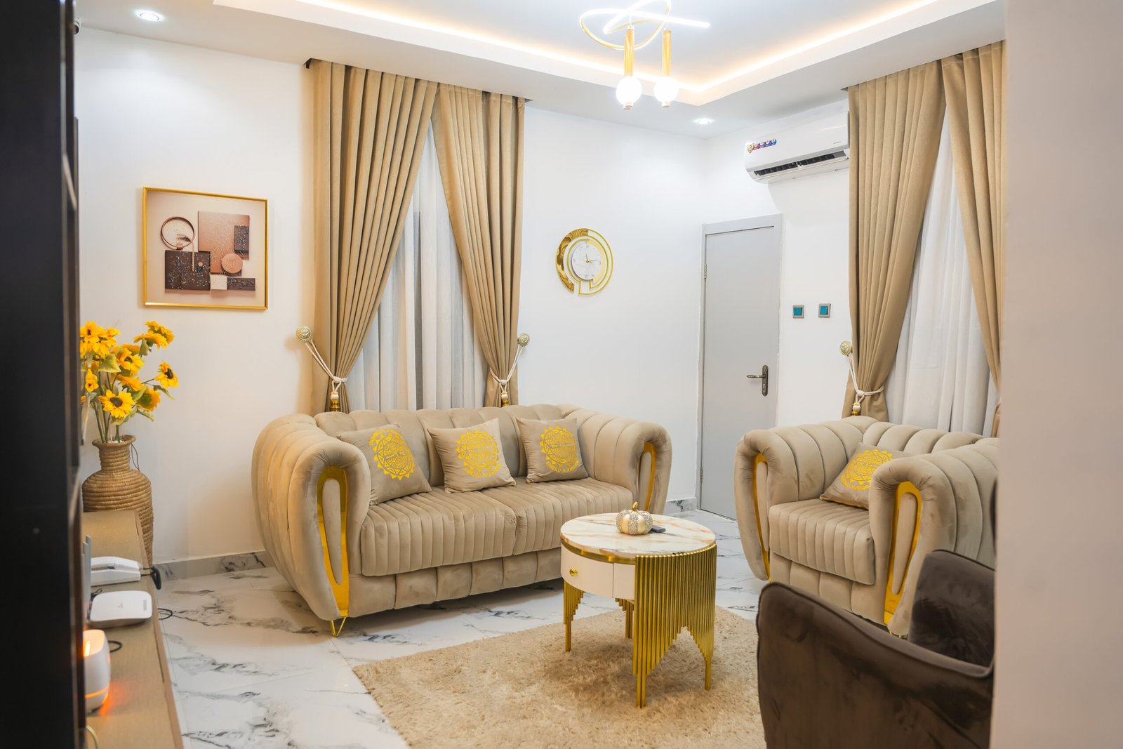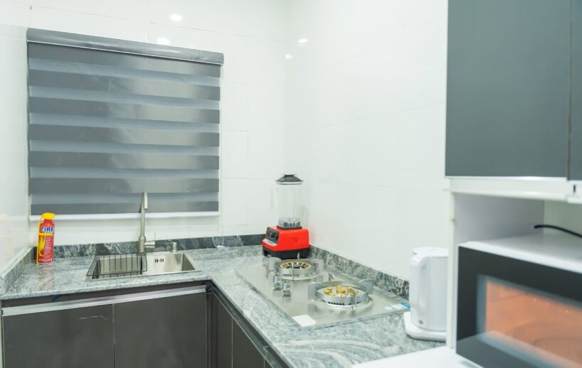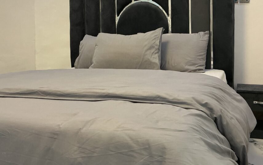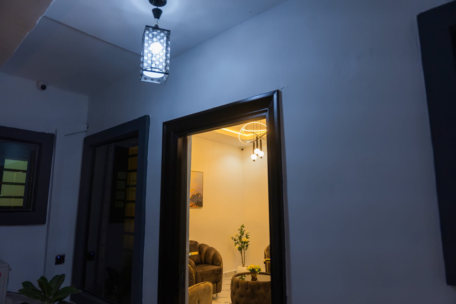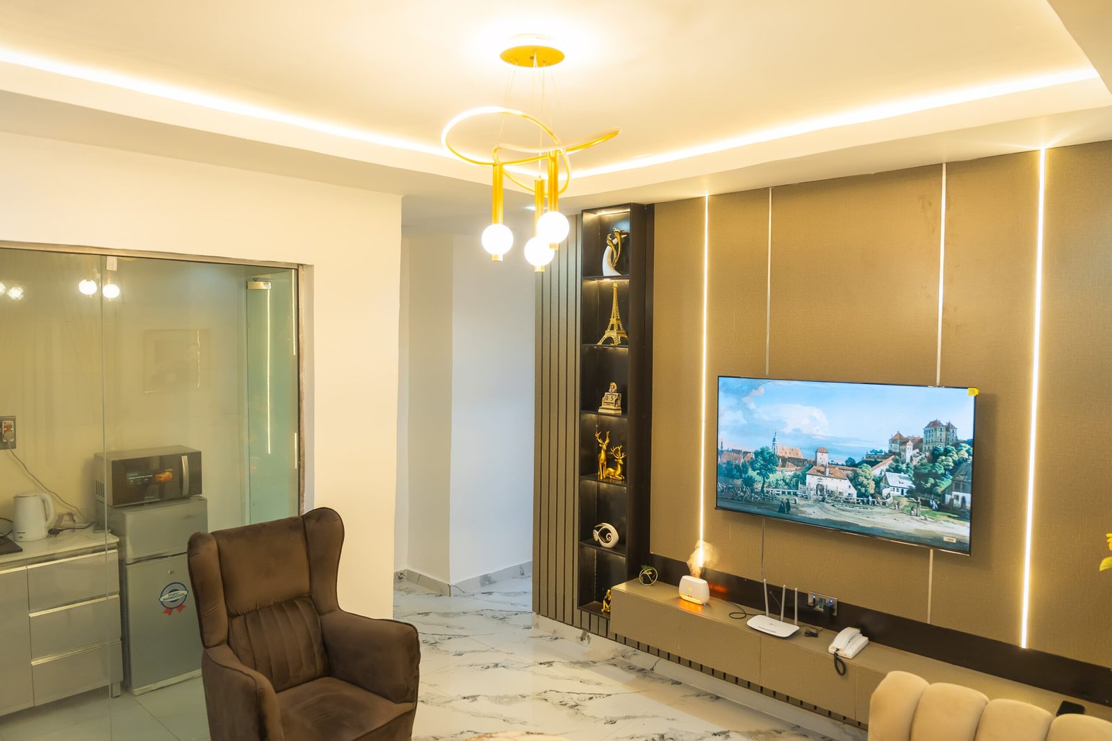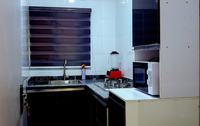 Stylishly designed with elegant décor, this spacious apartment offers a serene bedroom with an en-suite bathroom, a modern living room with three single-seater sofas, and a private balcony. Enjoy a fully equipped kitchen with a sink, microwave, refrigerator, blender, pots, and utensils.