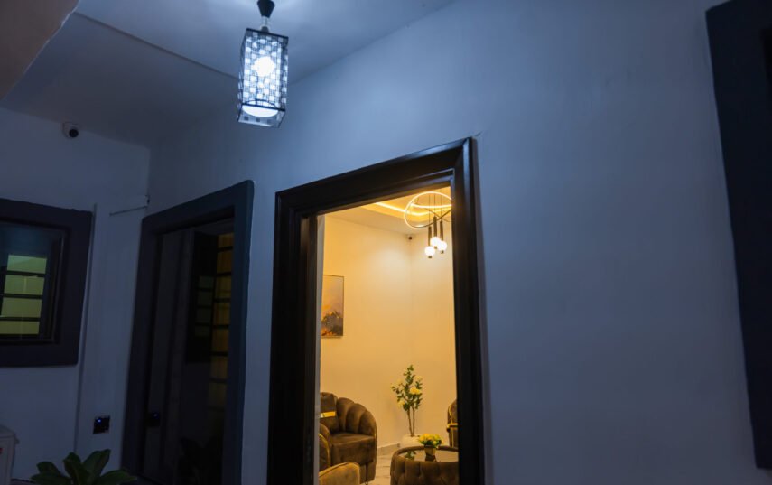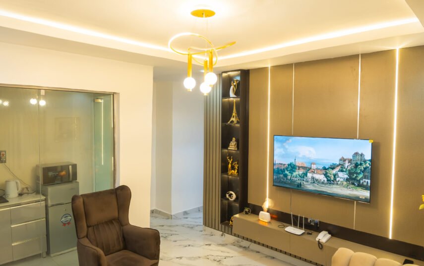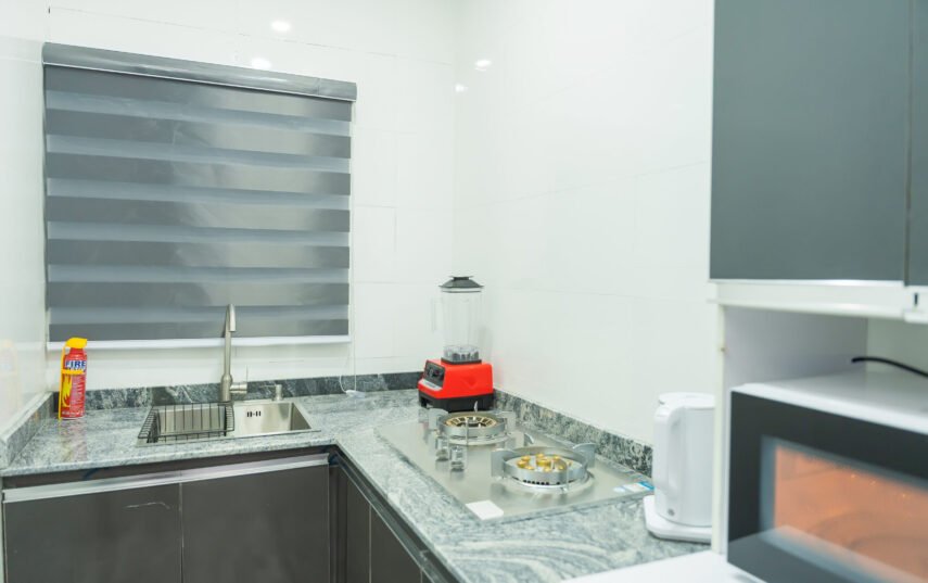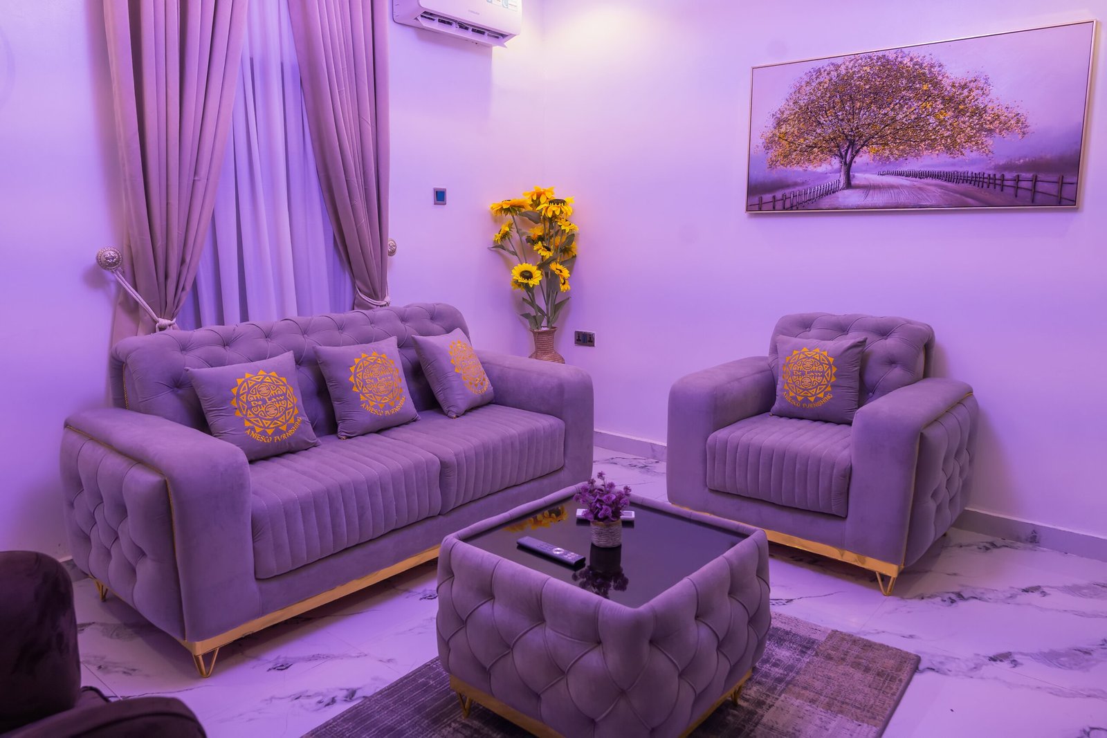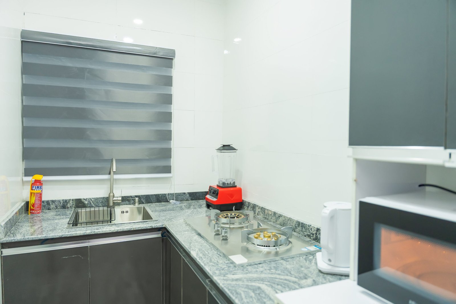 Our spacious and stylish one-bedroom apartment features a private bedroom with an en-suite bathroom, a cozy living room with three comfortable single-seater sofas, and a fully equipped kitchen for cooking. Enjoy modern amenities such as a 65-inch TV, free Wi-Fi, air conditioning, and 24/7 electricity. A separate visitor’s toilet in the living room offers added convenience for guests.